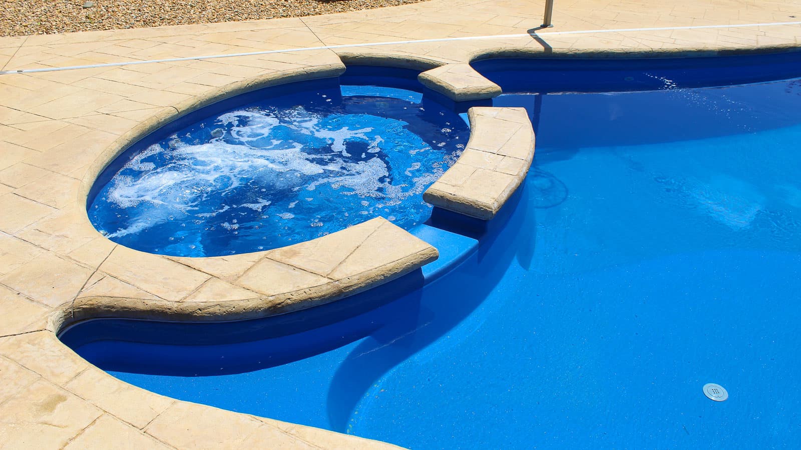 Built-in spa located at the shallow end next to entry steps and fun pad